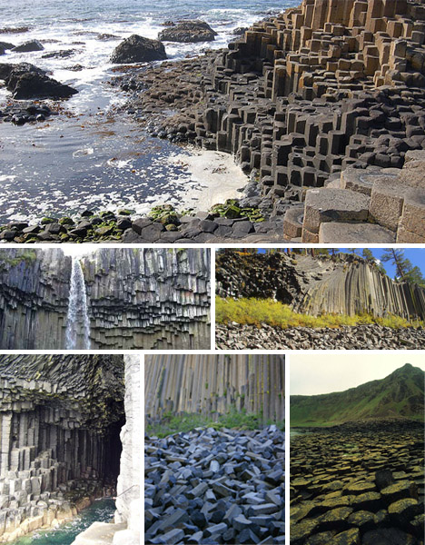 When a thick lava flow cools, it contracts vertically but cracks perpendicular to its directional flow with remarkable geometric regularity – in most cases forming a regular grid of remarkable hexagonal extrusions that almost appear to be made by man. One of the most famous such examples is the Giant’s Causeway on the coast of Ireland (shown above), though the largest and most widely recognized would be Devil’s Tower in Wyoming . Basalt also forms different but equally fascinating ways when eruptions are exposed to air or water.